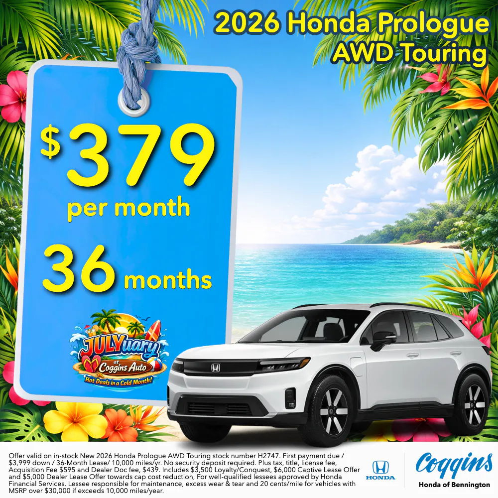 Offer valid on in-stock 2026 Honda Prologue AWD Touring stock number H2747. First payment due / $3,999 down / 36-Month Lease/ 10,000 miles/yr. No security deposit required. Plus tax, title, license fee, Acquisition Fee $595 and Dealer Doc fee, $439. Includes $6,000 captive lease offer, $5,000 dealer lease offer, and $3,500 lease loyalty/conquest toward toward Cap Cost Reduction*Available to current owners of any 2010 or newer Honda, Buick, Chevrolet, Chrysler, Dodge, Fiat, Fisker, Ford, GMC, Hyundai, Jeep, Kia, Mazda, Mini, Mitsubishi, Nissan, Polestar, RAM, Rivian, Scion, Subaru, Tesla, Toyota, VinFast and Volkswagen.. For well-qualified lessees approved by Honda Financial Services. Lessee responsible for maintenance, excess wear & tear and 20 cents/mile for vehicles with MSRP over $30,000 if exceeds 10,000 miles/year.